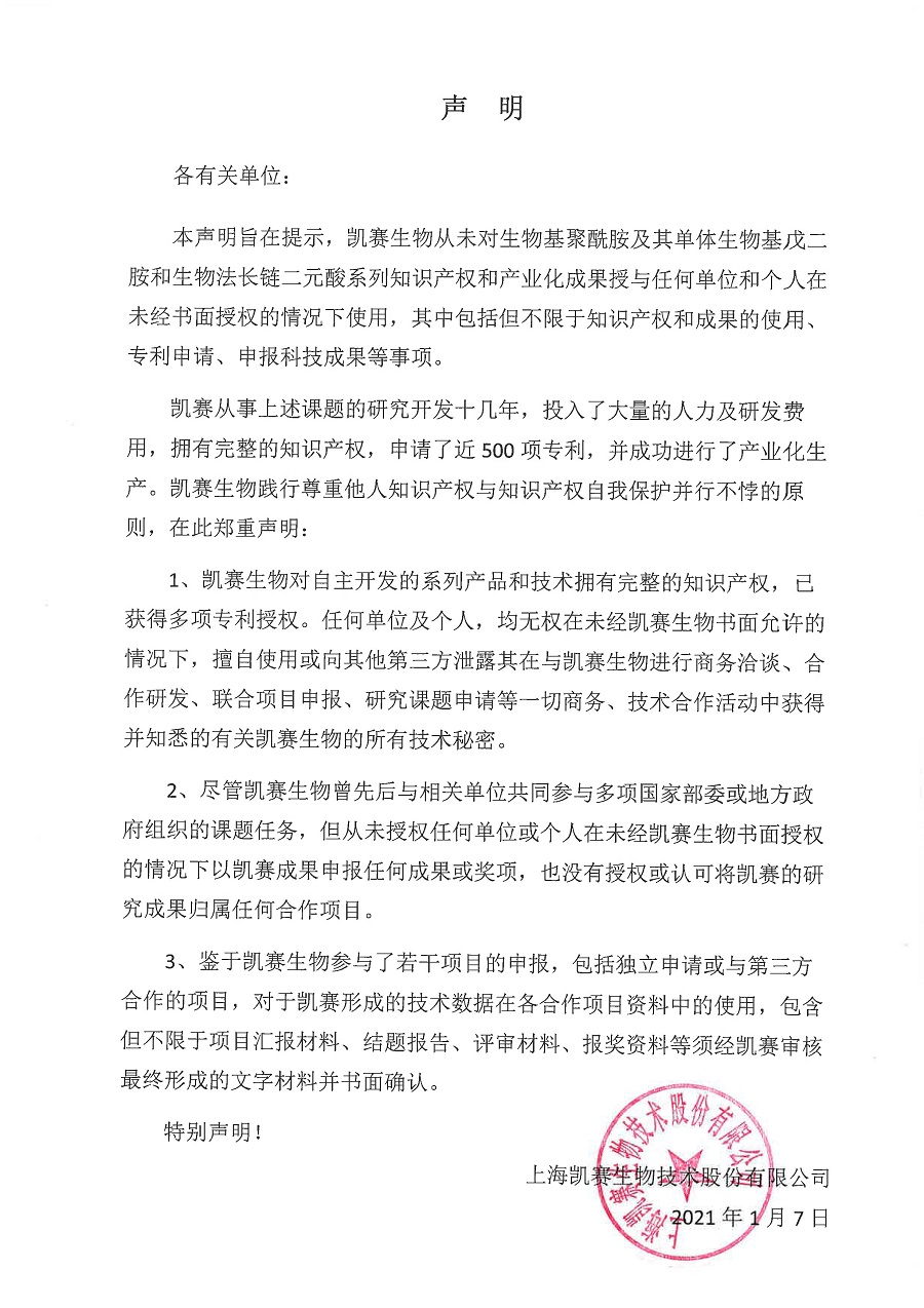 凯赛生物是全球生物法长链二元酸的主导供应商。2018年,凯赛生物的生物法长碳链二元酸被国家工业和信息化部、中国工业经济联合会评为制造业单项冠军产品。